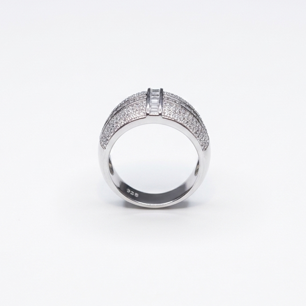 A bold sterling silver band (stamped ‘925’) heavily set with brilliant pavé-set Cubic Zirconia stones. The centerpiece is a prominent cross formed by channel-set baguette Cubic Zirconia, creating a sparkling and luxurious statement piece.