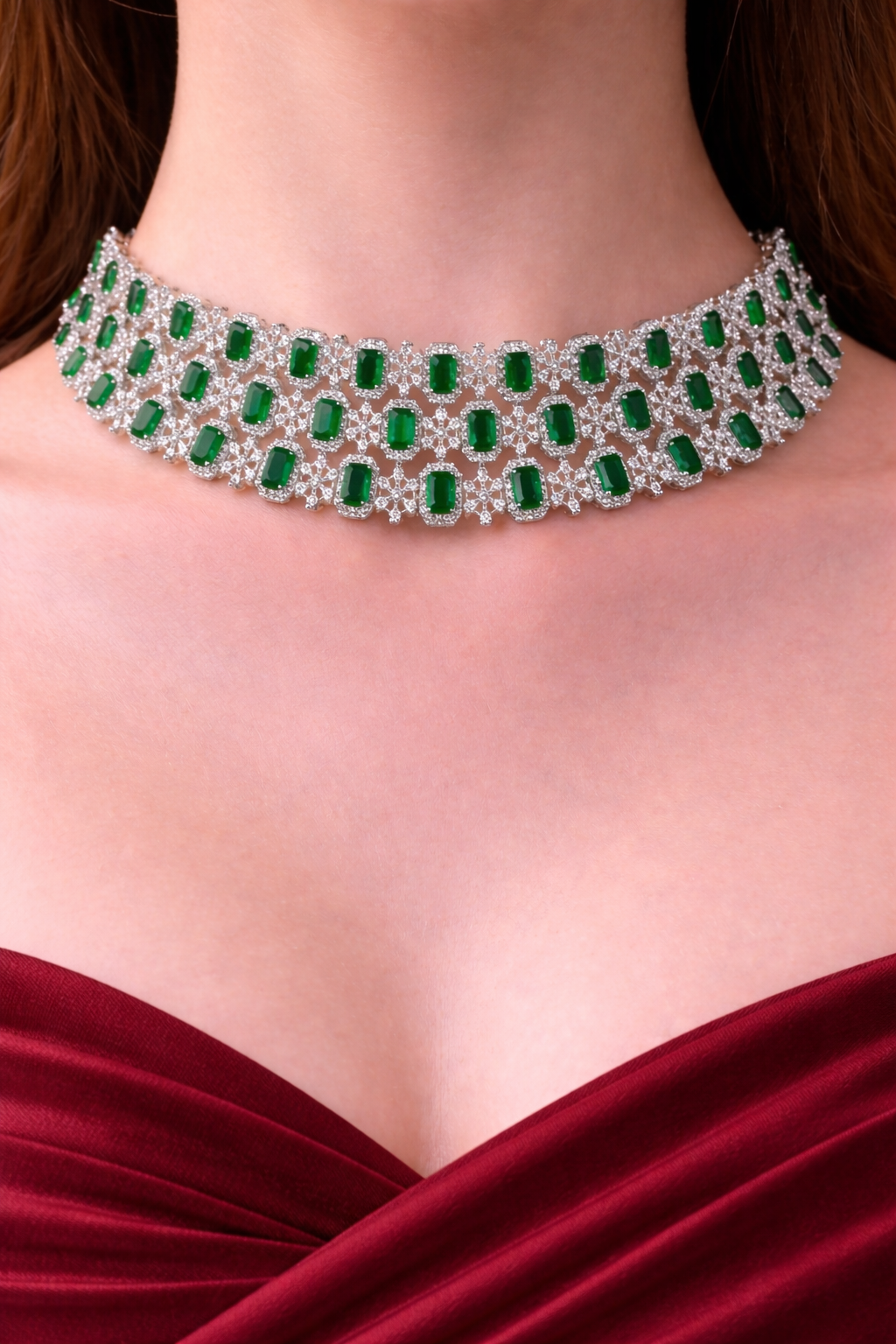 A statement of pure luxury, this emerald choker is crafted to exude regal elegance…The intricate design sits gracefully along the neckline , offering a bold yet refined look…
