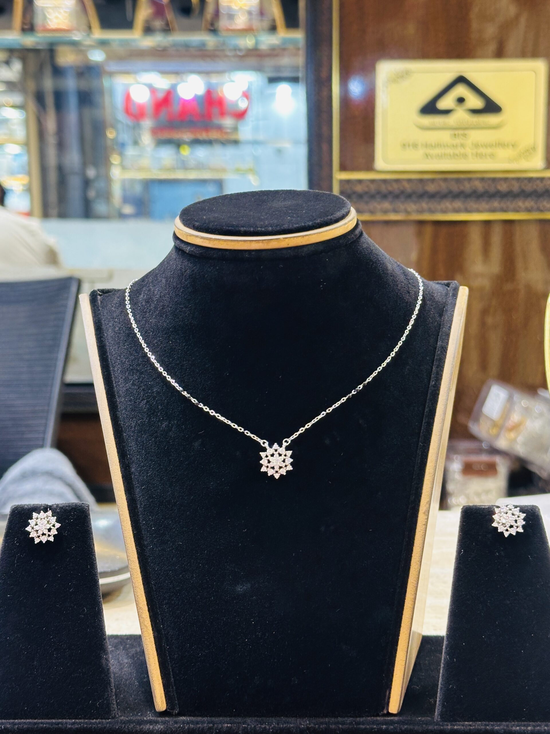 A delicate pendant chain adorned with beautifully crafted floral-inspired, paired with matching stud earrings…..