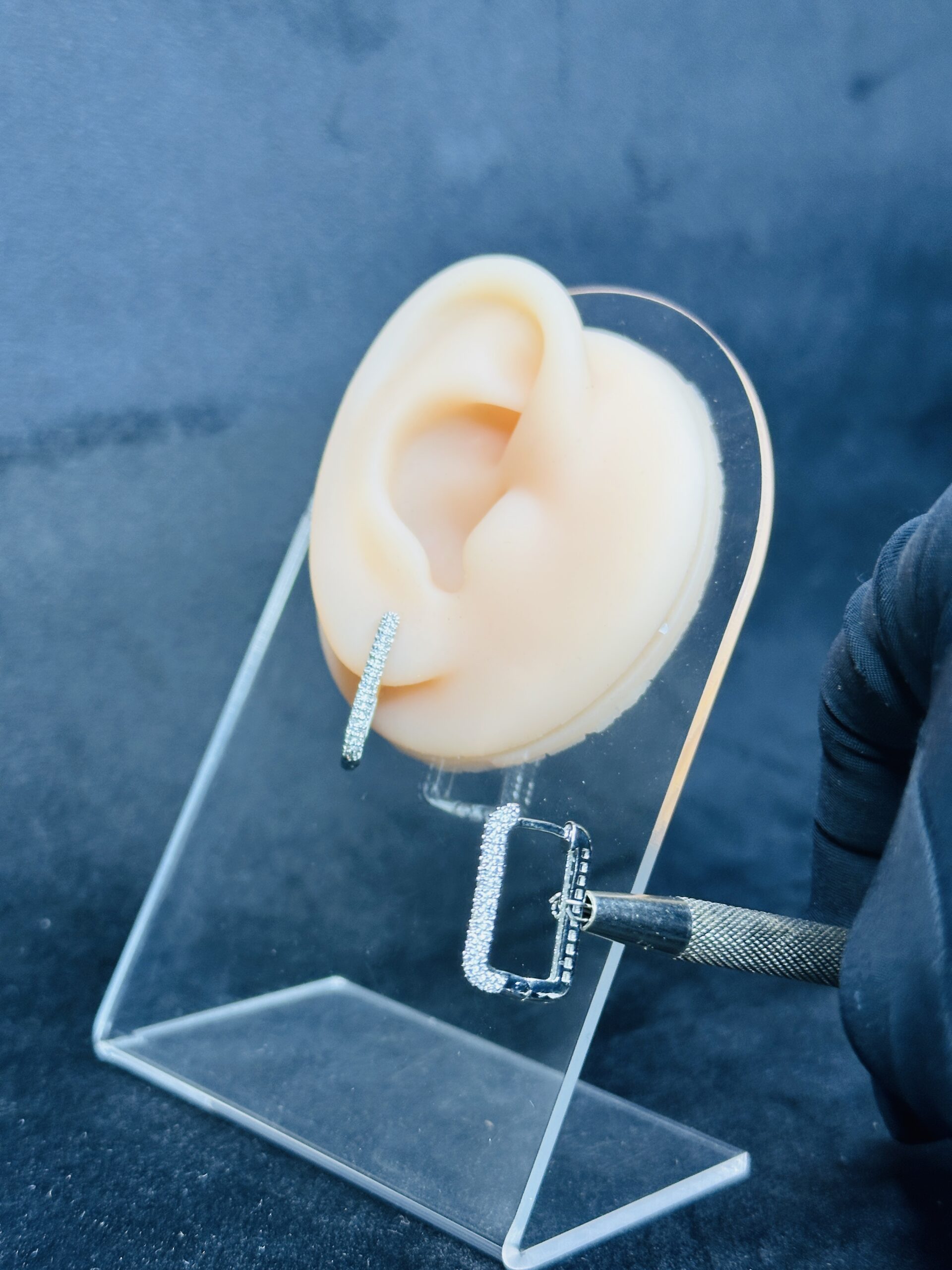 A modern rectangular hoop earrings features a sleek, structured silhouette enhanced with a line of shimmering crystals…