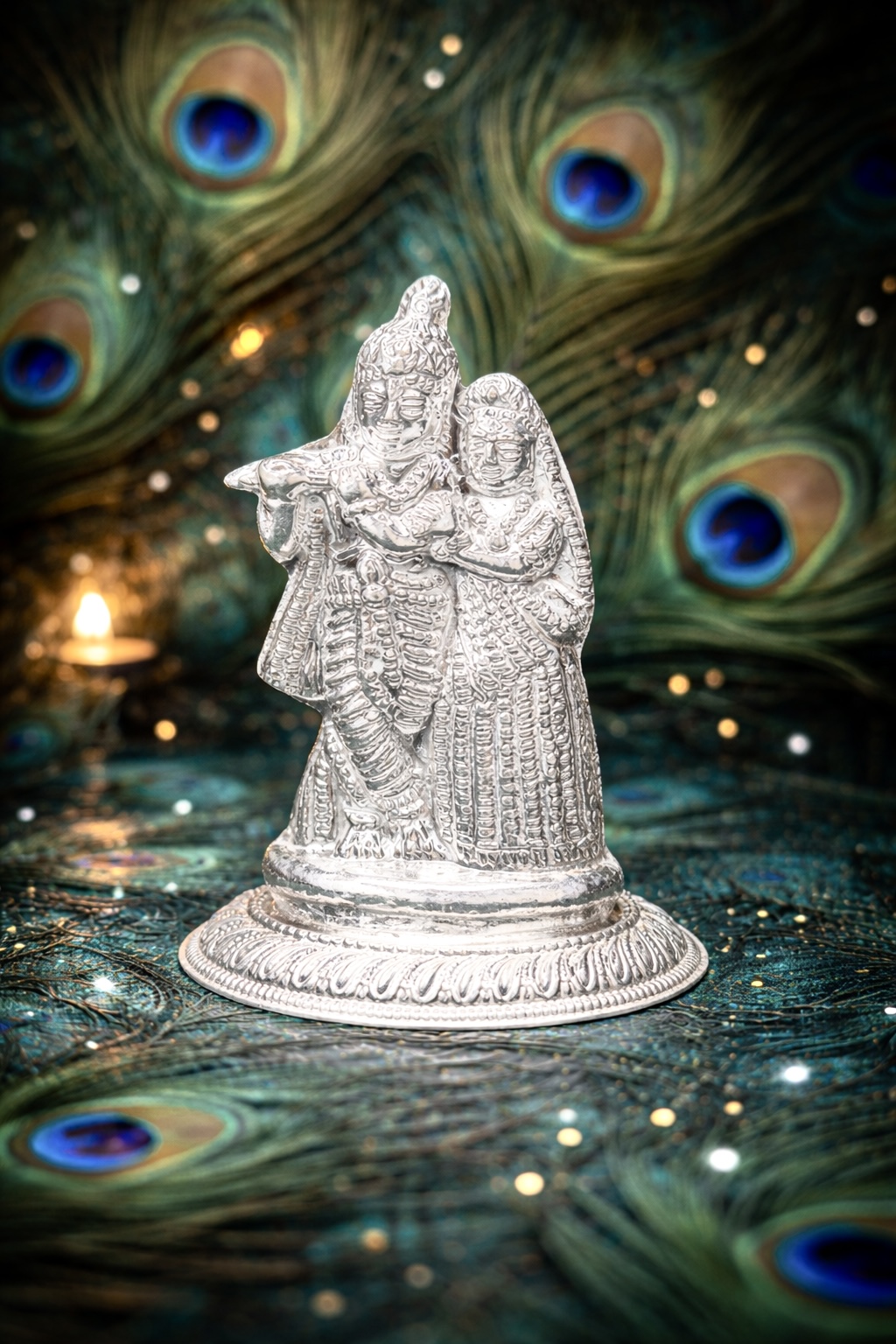 A graceful silver Radha Krishna murti, symbolizing eternal love, devotion and divine harmony…krishna playing the flute , stands beside Radha , representing the pure affection and spiritual connections….
