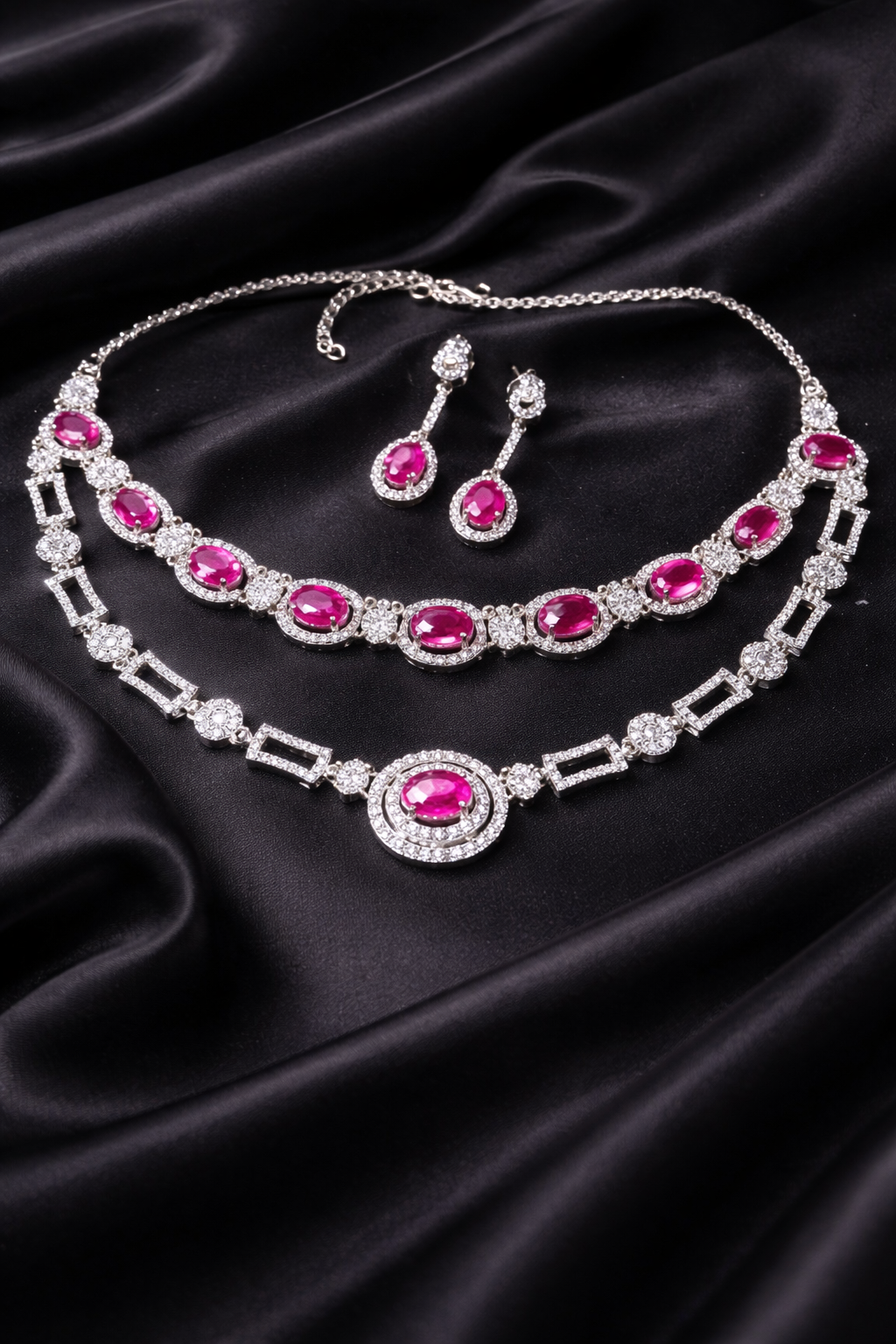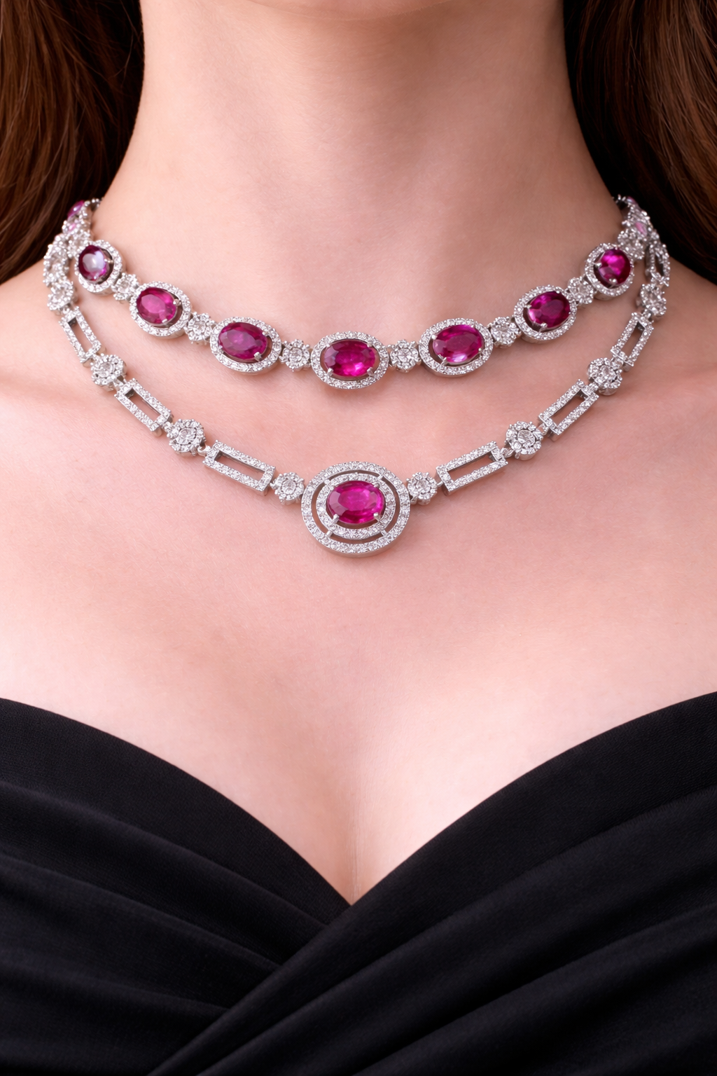 A luxurious dual- layered necklace that exudes timeless elegance and regal charm…This layered composition adds depth and dimension ,making the piece both sophisticated and eye-catching…