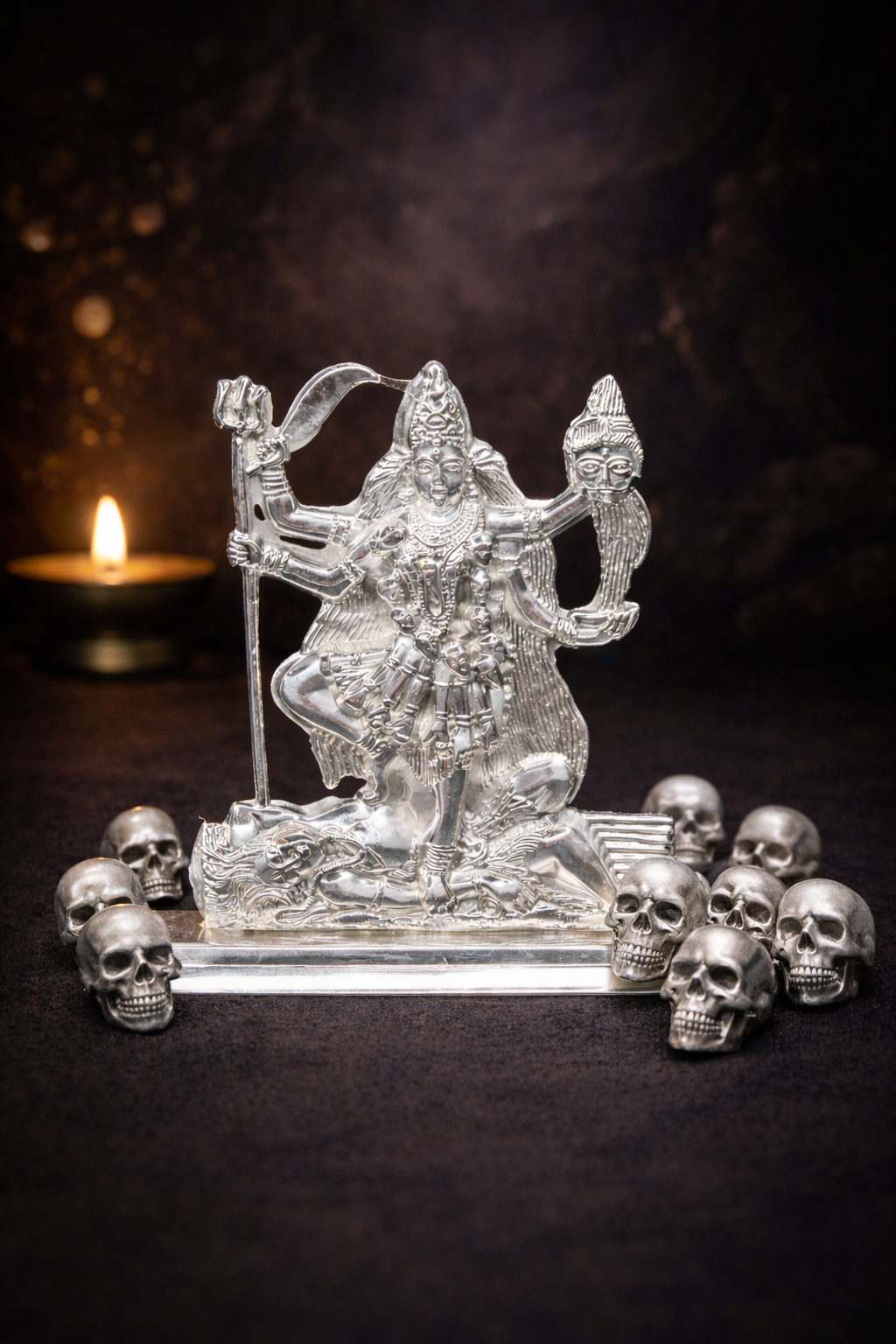 A striking silver Mahakali Murti , representing the fierce and protective form of the divine mother…maa kali stands victorious over evil ,holding sacred weapons and embodying the destruction of negativity and the triumph of truth….